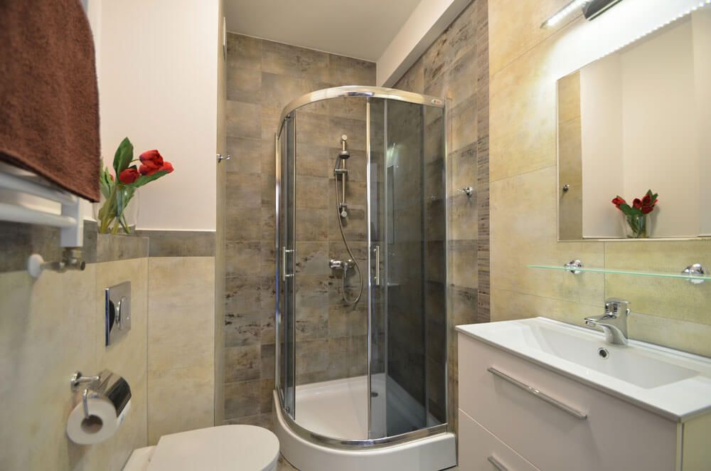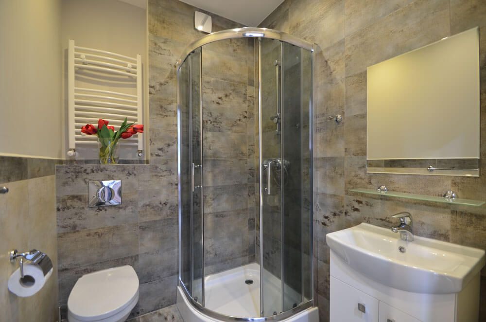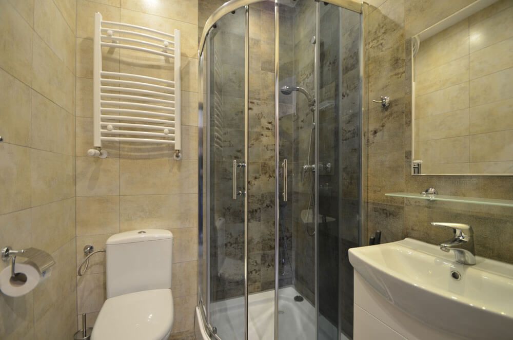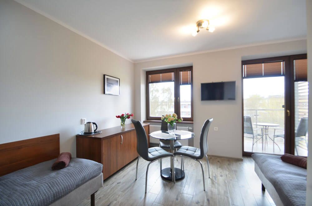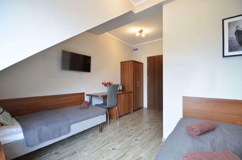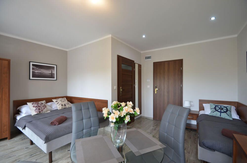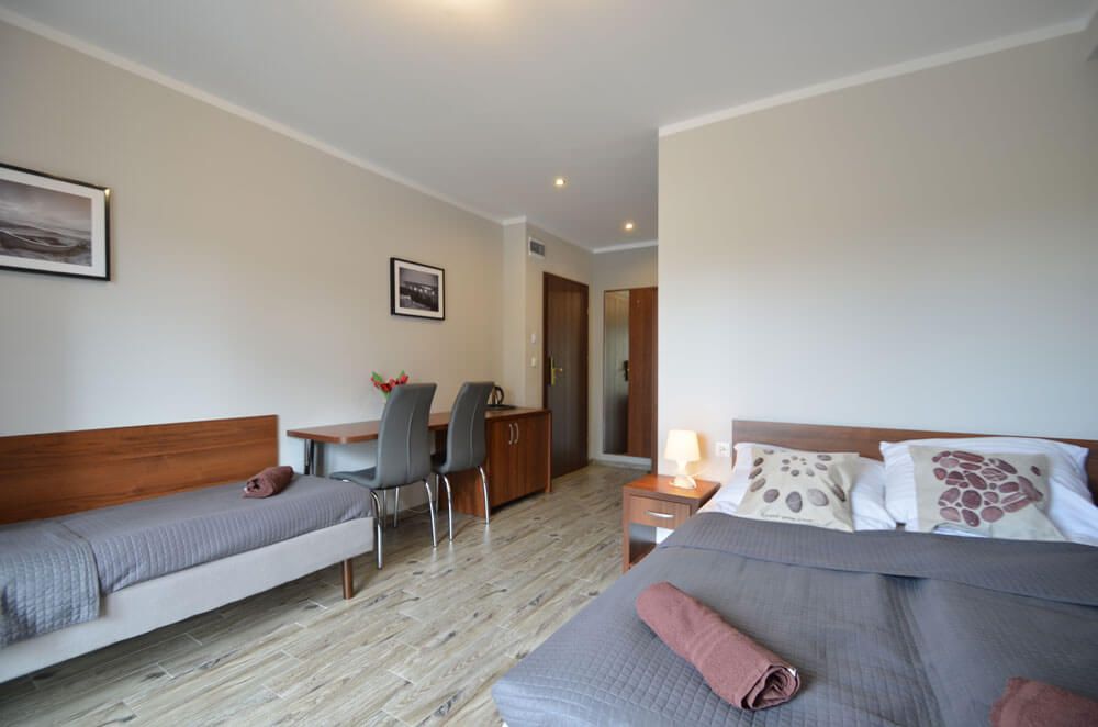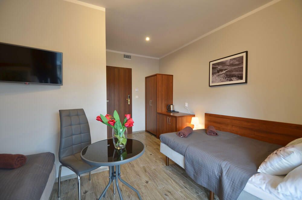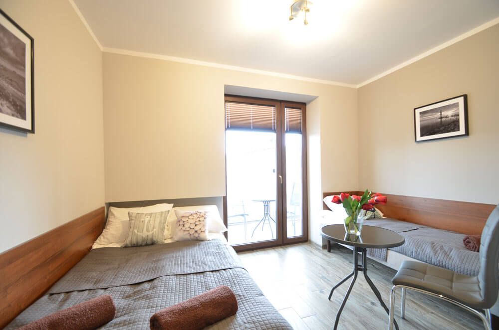 Pojedynczy pokój z podwójnym łóżkiem małżeńskim oraz jednym pojedynczym a w nim szafa, TV-LED, łazienka z prysznicem, balkon ze stolikiem i krzesłami, kącik kuchenny z lodówka w zabudowie, czajnik elektryczny, szklanki, talerzyki i sztuczce.