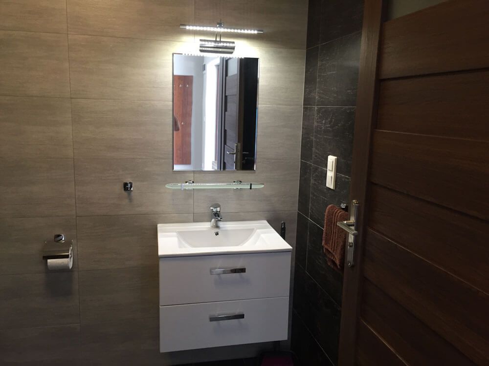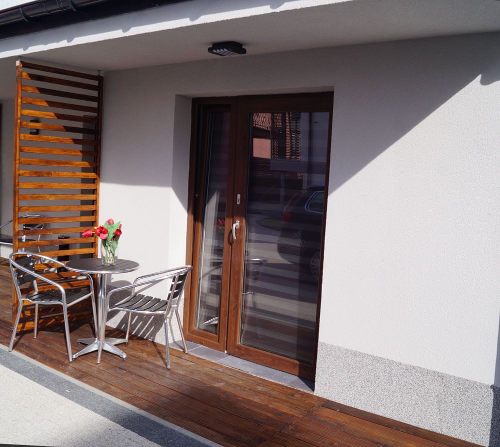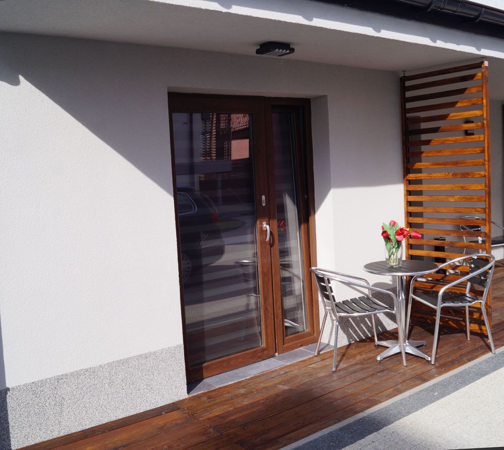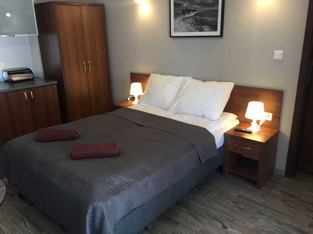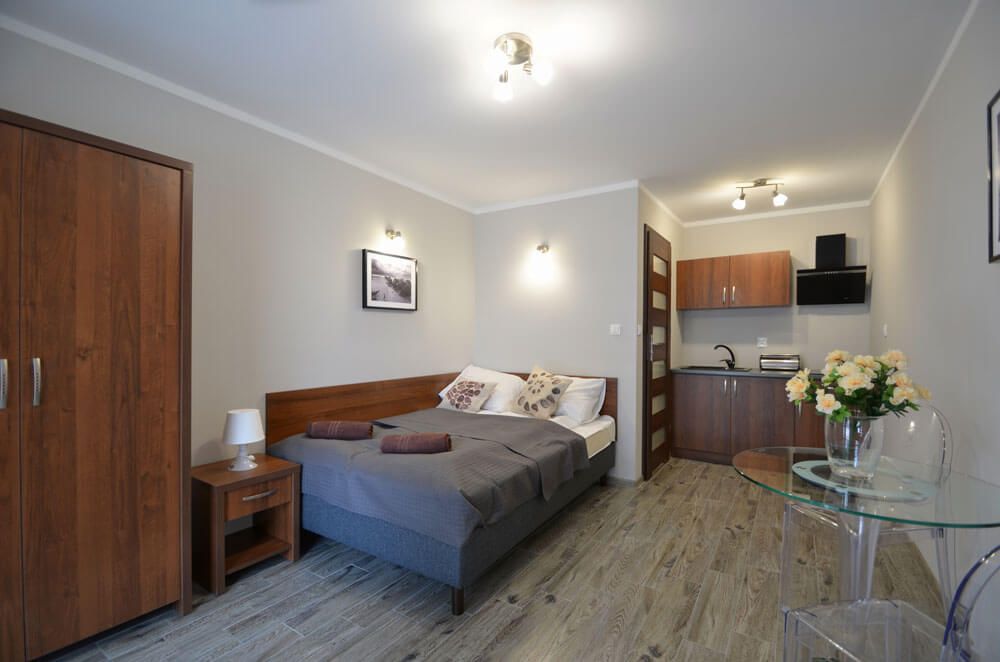 Studio składa się z pokoju z podwójnym łóżkiem małżeńskim a w nim stolik, krzesła, szafa, TV-LED, łazienka z prysznicem, zadaszony taras przed wejściem z meblami ogrodowymi, aneks kuchenny: lodówka, zlewozmywak, podwójna indukcyjna płyta grzewcza, pochłaniacz, czajnik elektryczny, naczynia, garnki.